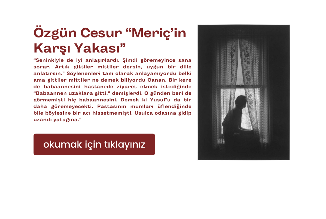 “Bir daha küçük kara balığı gören olmamış.Masalı anlatan yaşlı balık ve küçük balıklar uyumuş. Bir tek küçük kırmızı balık uyuyamamış. Tüm gece okyanusu ve küçük kara balığı düşünüp durmuş.” Canan dün gece bu masalı dinlerken kendisini hep küçük kara balık olarak hayal etmişti. Tıpkı onun gibi cesur olacak, kuşandığı kılıcıyla derede ilerleyip balıkçılları alt edecek, bütün balıkları kurtarıp okyanusa ulaştıracaktı. Ama hayat ona küçük kırmızı balık rolünü uygun görmüştü demek ki. Kapattı gözlerini. Tüm gece Meriç’in karşı yakasını ve Yusuf’u düşündü.